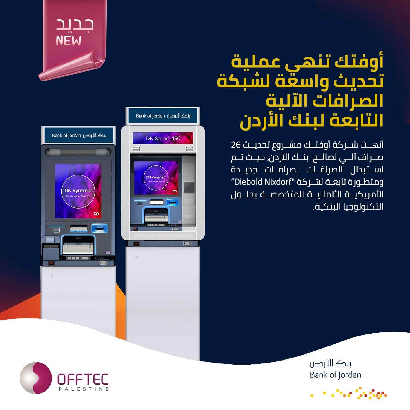 رام الله، أنهت شركة أوفتك مشروع تحديث 26 صراف آلي لصالح بنك الأردن، حيث تم استبدال الصرافات بصرافات جديدة ومتطورة تابعة لشركة "Diebold Nixdorf” الأمريكية الألمانية المتخصصة بحلول التكنولوجيا البنكية.